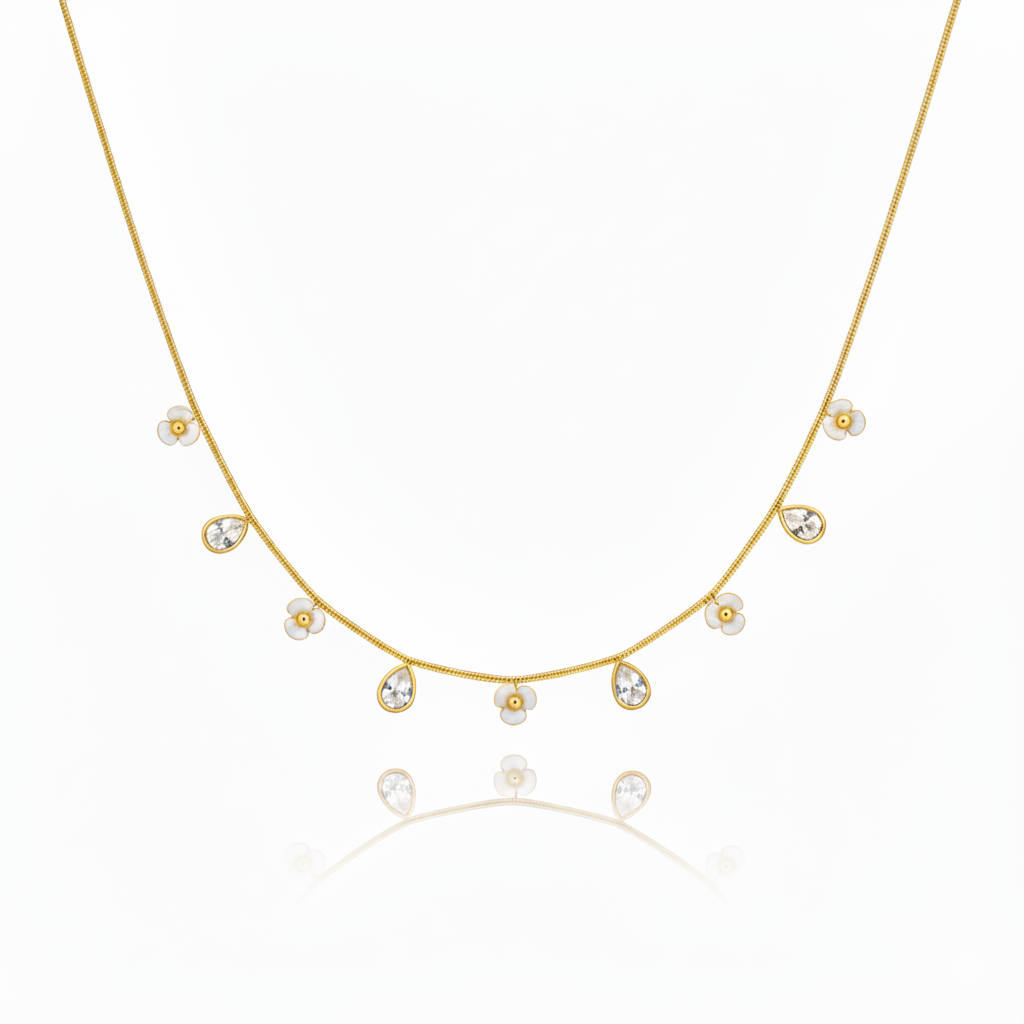 Elevate your everyday elegance with this stunning 18K gold-plated stainless steel necklace featuring delicate white enamel flowers adorned with sparkling cubic zirconia stones.