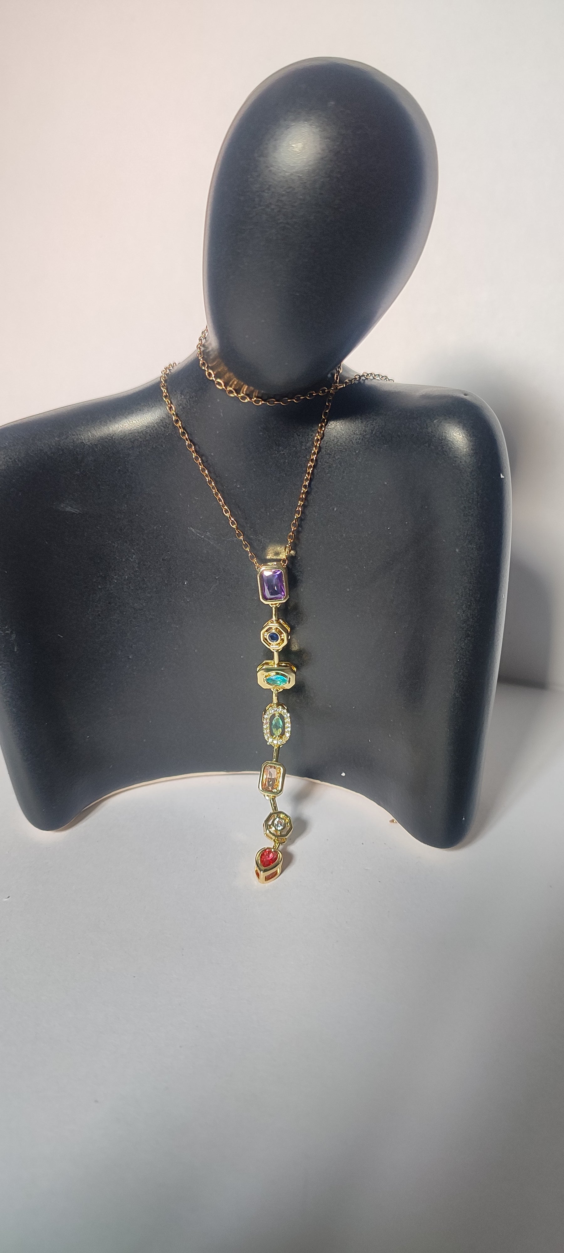 Introducing our Multi-Gemstone Drop Necklace – a stunning cascade of colours handcrafted in 18K gold-plated, waterproof metal.
